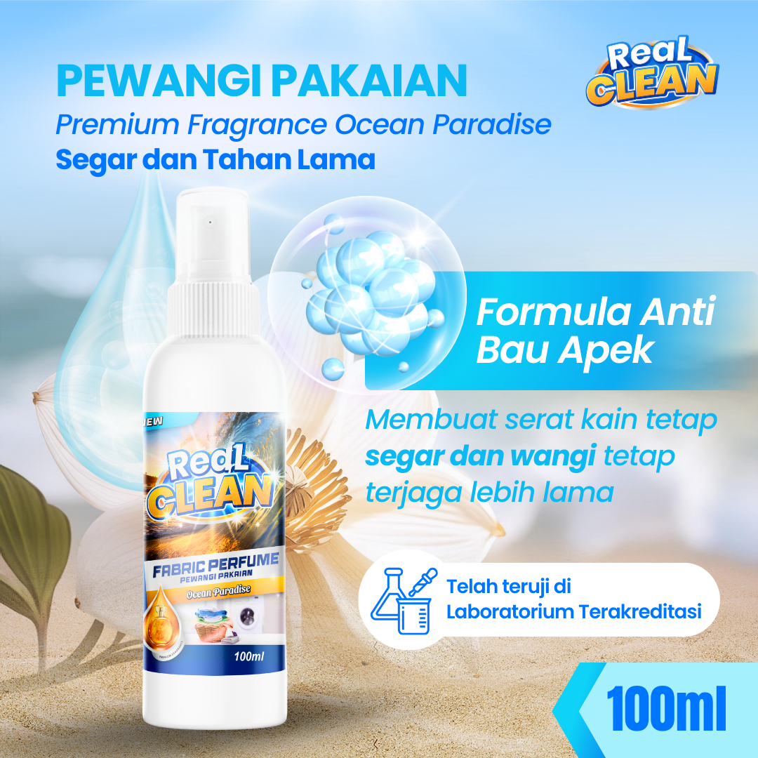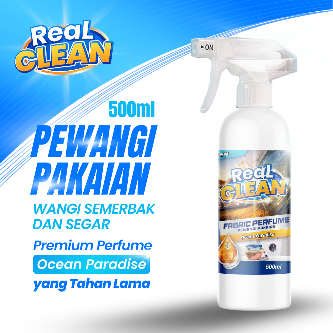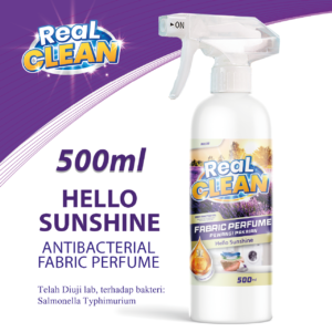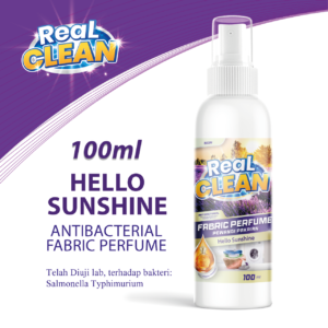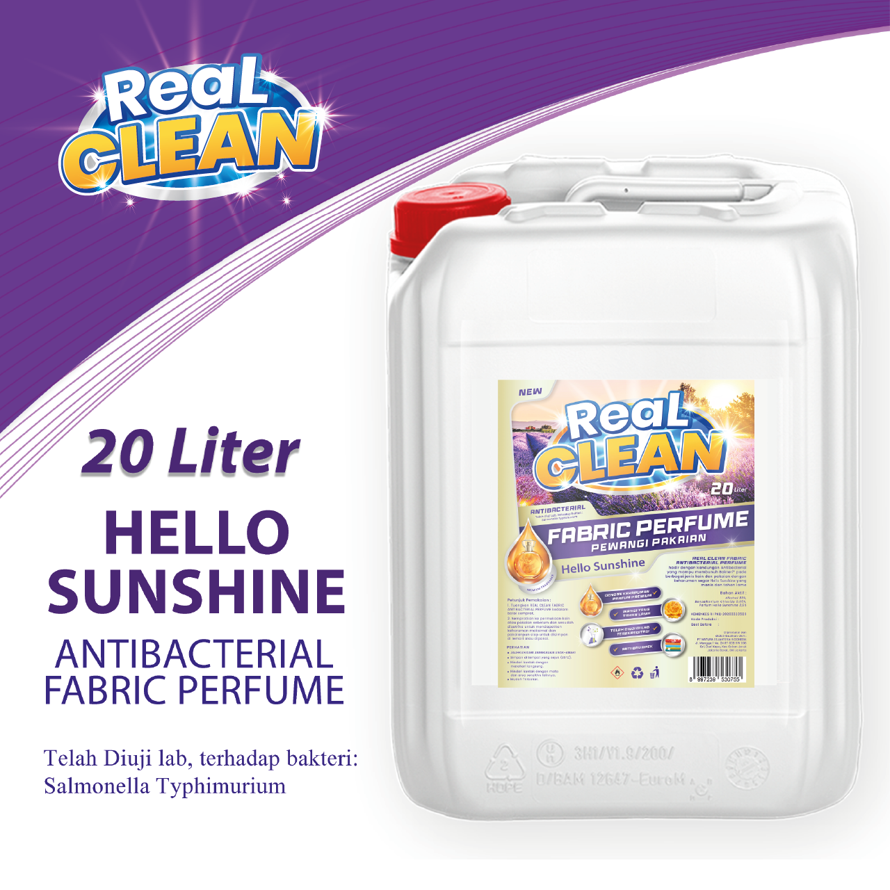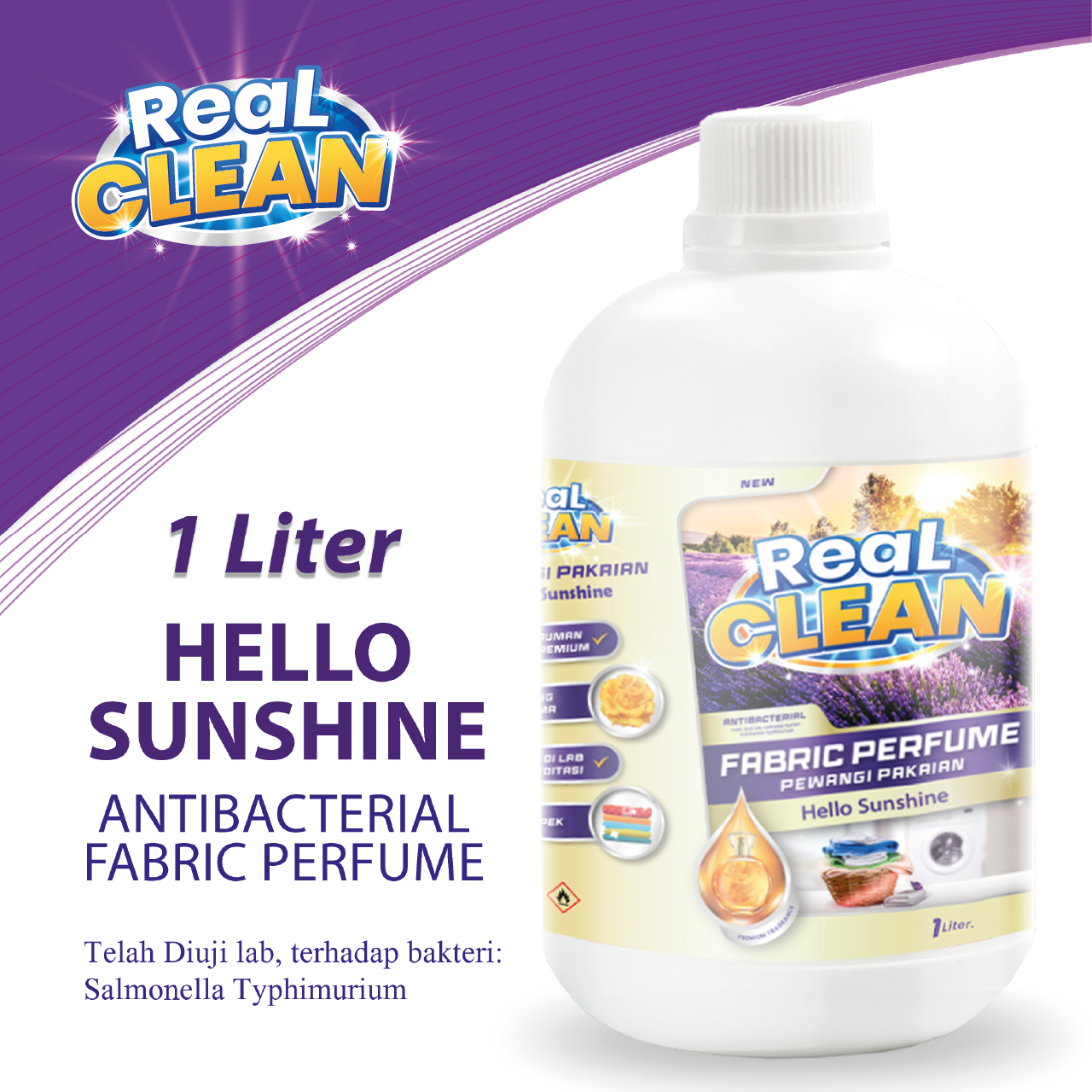 New Real Clean Fabric Perfume hadir dengan wangi premium yang mewah dan awet tahan lama, dilengkapi dengan kandungan antibacterial yang mampu membunuh 99.99 % kuman dan bakteri pada berbagai jenis kain dan pakaian dengan keharuman yang segar Hello Sunshine manis dan tahan lama.