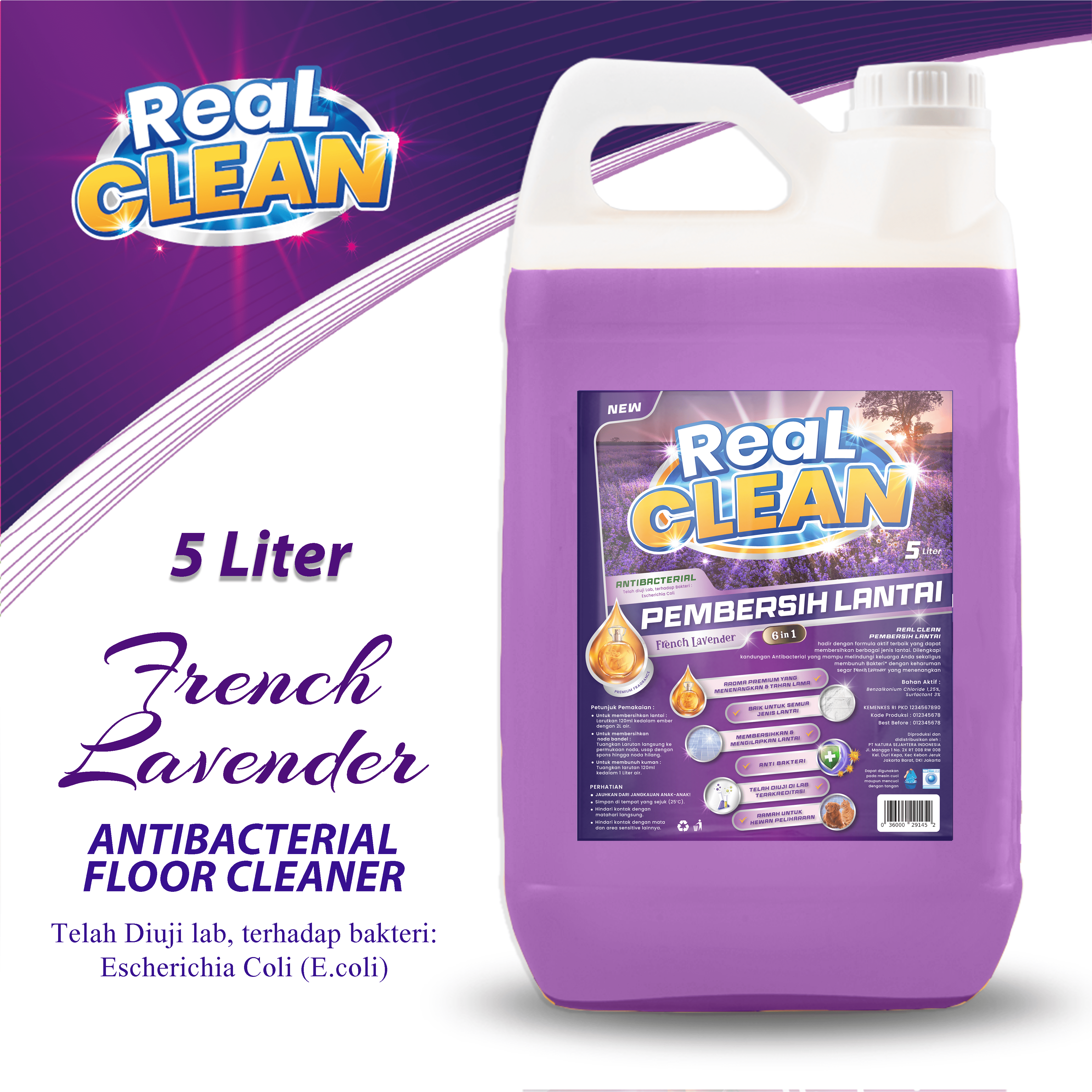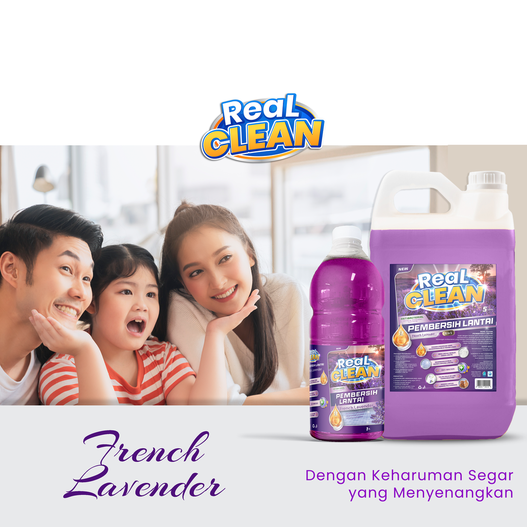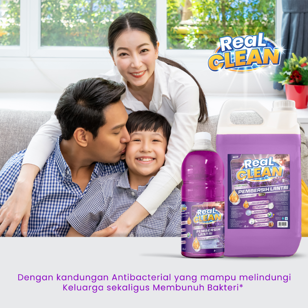 Rumah yang bersih dan sehat menjadi dambaan setiap keluarga, Real Clean Pembersih lantai hadir dengan formula aktif terbaru yang dapat membersihkan berbagai jenis lantai, dilengkapi kandungan antinbacterial yang mampu melindungi keluarga anda sekaligus membunuh 99,99 % kuman dan bakteri dengan keharuman segar dan menenenangkan french lavender.